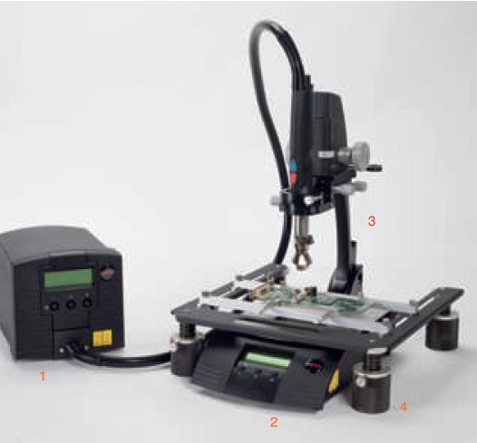 The MRS-1100A modular repair system consists of the following four components: 1. HCT-1000 programmable handheld convection tool 2. PCT-1000 programmable preheater 3. ATH-1100A Adjustable Tool Bracket 4. BH-2000 independent circuit board bracket
